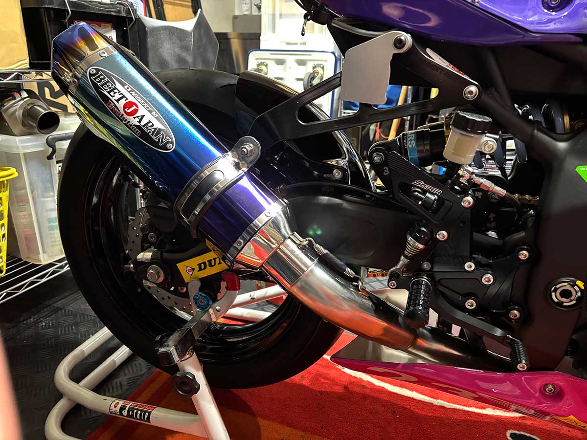 サーキットを走行していて最高速が伸びない…とお悩みのお客様からのご依頼でした。現状把握のためにシャーシダイナモを使いパワーチェックと点検を行い、お手持ちのマフラーと交換し再度パワーチェックを行います。見た目では分からない原因を探ります。